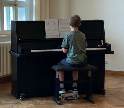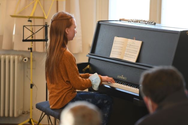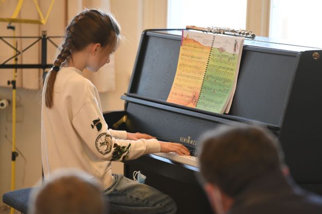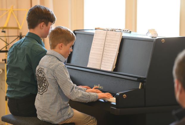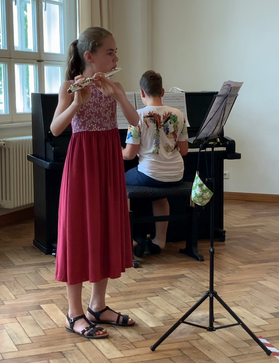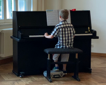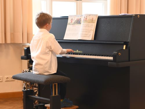Rebekka und Mattis spielen das „Froschkonzert“ vierhändig. Für Mattis, der erst seit wenigen Monaten Unterricht erhält, eine beachtliche Leistung! Max hingegen spielt bereits, seit er fünf Jahre alt ist. Entsprechend trägt er „My heart will go on“ und „Für Elise“ auswendig vor. Greta ist nun zum zweiten Mal dabei und wagt sich an einen „Alten Tanz“ sowie ein „Andante grazioso“ von W. A. Mozart.