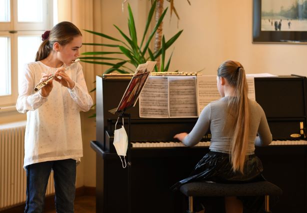 Jugend-musiziert-Preisträgerin Lena (links), Helena und ihr Klavierbegleiter Alex (rechts) spielten mehrere Stücke aus ihrem umfangreichen Repertoire, das ihnen 2021 erste Plätze eingebracht hatte: