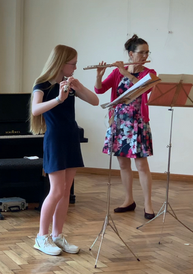 Helene (links) spielte einen brasilianischen Samba. Simge intonierte ein ursprünglich ägyptisches Liebeslied, Helena (rechts) „tanzte“ mit der Flöte die Seguidilla von K. Zgraja.
