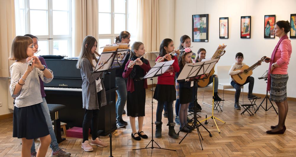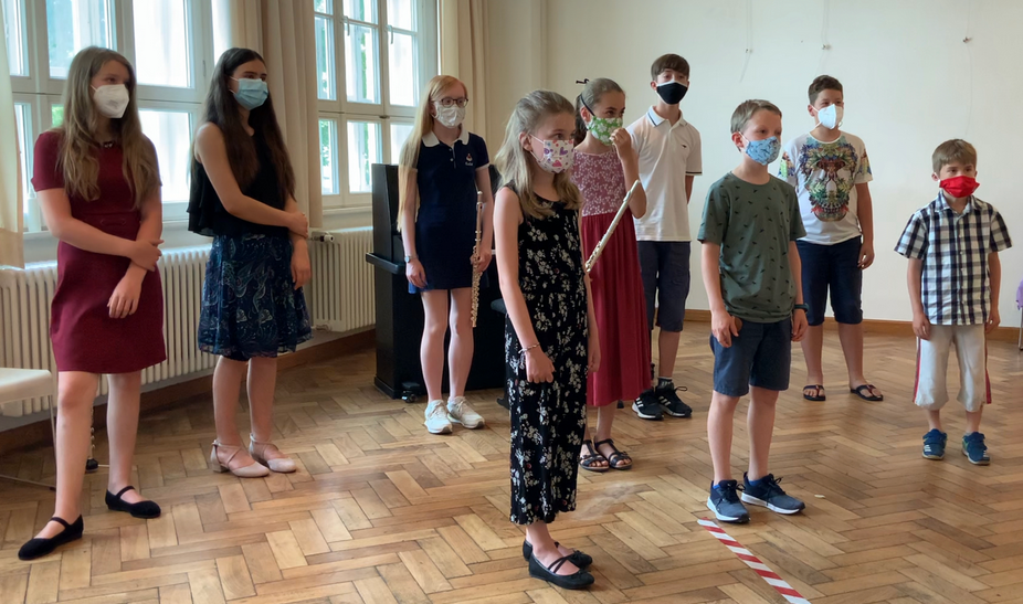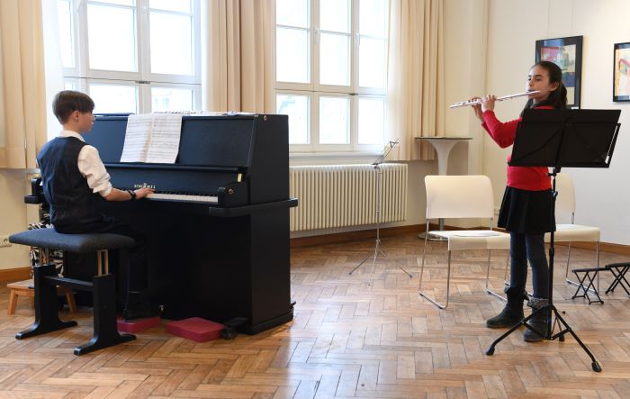 Shalom chaverim – Frieden für alle, erklingt als Auftakt zu einem vielfarbigen Schülerkonzert mit Flöten, Klavier und Cello. Für einige Kinder war es eine willkommene Gelegenheit, ihr Können zu zeigen, nachdem sie erstmals in diesem Schuljahr wieder regelmäßigen Präsenzunterricht genießen konnten.